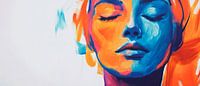 Heldere kleuren creëren een harmonieuze compositie van warme oranje en koele blauwe tinten die de innerlijke rust en sereniteit van een vrouw belichamen. Haar gesloten ogen stralen rust uit, terwijl de dynamische penseelstreken levendigheid toevoegen. Dit kunstwerk is perfect voor een woonkamer om een inspirerende sfeer te creëren.