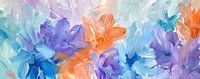 De compositie combineert tinten van lila, blauw en turquoise met warme accenten van oranje en perzik. De penseelstreken zijn breed en expressief, wat een gevoel van beweging en levendigheid creëert. Hoewel het werk geen…