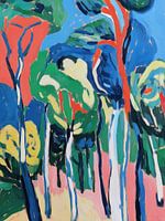 Een expressief abstract schilderij met een levendige bosgezicht. Vette streken groen, rood, blauw en geel lopen door elkaar en suggereren bomen en gebladerte, waarbij organische vormen samensmelten met levendige, dromerige kleuren. De compositie voelt levendig aan en vangt zowel beweging als emotie in de natuur.