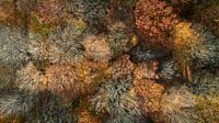 Een betoverend luchtfoto van een bos in volle herfsttooi. Warme tinten van goud, koper, roest en dieprood vloeien samen tot een natuurlijk kleurenpalet dat bijna schilderachtig aandoet. Het spel van licht en schaduw tussen de boomkronen geeft diepte en structuur, terwijl het perspectief van bovenaf zorgt voor een verrassend en modern…