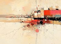 Details: abstracte kunst, moderne schilderij, dynamisch, oranje, rood, wit, beige, gespatte verf,…