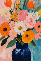 Kleurexplosie in Kobaltblauw toont een levendige compositie van bloemen, geschilderd met een paletmes in een expressieve, dynamische stijl. De opvallende kobaltblauwe vaas vormt het middelpunt, waarin delicate roze rozen en stralende oranje tulpen elkaar omarmen in een harmonie van warme tinten. De bloemen lijken bijna uit de vaas te springen, hun bloemblaadjes zijn dik aangebracht met verf, wat textuur en beweging creëert. De aquablauwe achtergrond zorgt voor een luchtige, serene sfeer, die het geheel in balans brengt en de felle kleuren laat schitteren.