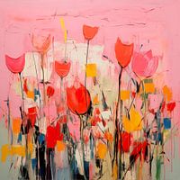 Dit expressieve werk, getiteld 'Kleurexplosie in Pastel', is een levendige weergave van abstracte bloemvormen. Er wordt gespeeld met de tegenstelling van natuurlijke eenvoud en de complexiteit van kleur, wat resulteert in een stuk dat zowel de geest kalmeert als de zintuigen prikkelt. De roze achtergrond geeft het een warme, zachte uitstraling, perfect voor het verrijken van een modern interieur met een vleugje kleur.