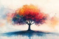 Dit levendige waterverfschilderij toont een kleurrijke boom als metafoor voor leven en diversiteit. De explosieve kroon symboliseert de rijkdom aan ervaringen, terwijl de stevige stam stabiliteit suggereert. Geworteld in een mysterieuze weerspiegeling, viert het werk de schoonheid van diversiteit en groei. De spattende verfeffecten creëren een dromerige sfeer, die uitnodigt tot reflectie over de samenhang in natuur en leven.