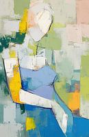 Kleurig Abstract Portret Van Vrouw - In dit abstract portret schilderij zie je een vrouwelijke figuur met een lichtblauwe top en duidelijke kleurrijke achtergronden in groen, geel en oranje.