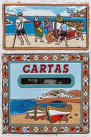 Een uitermate kleurrijk gedecoreerde brievenbus met afbeeldingen van kleine vissersbootjes aan de kust en de handeling om ze collectief uit het water te slepen op het Spaans Canarische eiland Fuerteventura.
