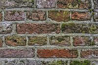 Wat een details zijn er te ontdekken in zes lagen metselwerk! Een kleurenpalet van grijs, bruin, rood en paars. Licht- en donkergroen mos. Verspreide witte vlekken, een rond gat. De onregelmatigheid van de mortel, het reliëf van de stenen. Een bont kunstwerk, een co-productie van mens en natuur.