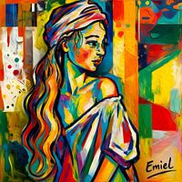 Een vrouw met hoofddoek en krullende haren kijkt naar links. Expressionistisch en deels figuratief werk, gemaakt met een mix van technieken. Voor dit werk heb ik de vrouw getekend in houtskool, deze houtskool tekening is de input geweest voor de gekleurde versie in AI.