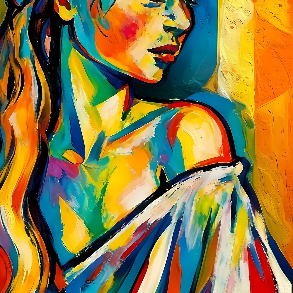 Een vrouw met hoofddoek en krullende haren kijkt naar links. Expressionistisch en deels figuratief werk, gemaakt met een mix van technieken. Voor dit werk heb ik de vrouw getekend in houtskool, deze houtskool tekening is de input geweest voor de gekleurde versie in AI.