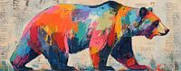Kleurige Dier - Op dit schilderij zie je een grote, kleurrijke beer die op een neutrale achtergrond staat met schematische teksten, waarbij felle kleuren zoals rood, blauw, en geel samenkomen in een moderne stijl.