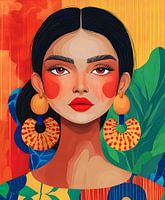 Een levendige portret van een vrouw met een krachtige uitdrukking, gekleed in een kleurrijke blouse en opvallende oorbellen, die de schoonheid en diversiteit van culturele identiteit viert.