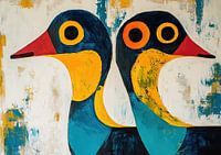 Kleurige Vogels - In dit schilderij zie je een kleurrijk en abstract ontwerp van twee vogels met opvallende gele en oranje accenten, tegen een achtergrond van blauw en wit, waardoor de vormen en kleuren goed tot hun recht komen.