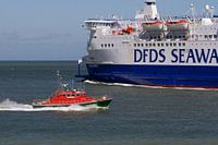 Grote ferryboot van DFDW Seaways wordt ingehaald door kleine snelle boot bij het Nauw van Calais op een zonnige dag. De frisse kleuren van de boten en het opspattende water roepen de associatie op met strand, reizen en vakantie