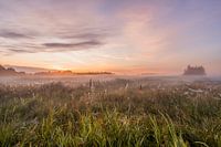 Prachtige schilderachtige foto van de vroege ochtendmist en de pastelkleuren van de zonsopkomst. Het hoge gras in het weiland zit vol met spinnenwebben en dauwdruppels wat een zachte nevel over het weiland geeft. De foto heeft een dromerige en mysterieuze uitstraling. De foto is dichtbij Giethoorn genomen in het nationaalpark de Weerribben. Overijssel in Nederland.