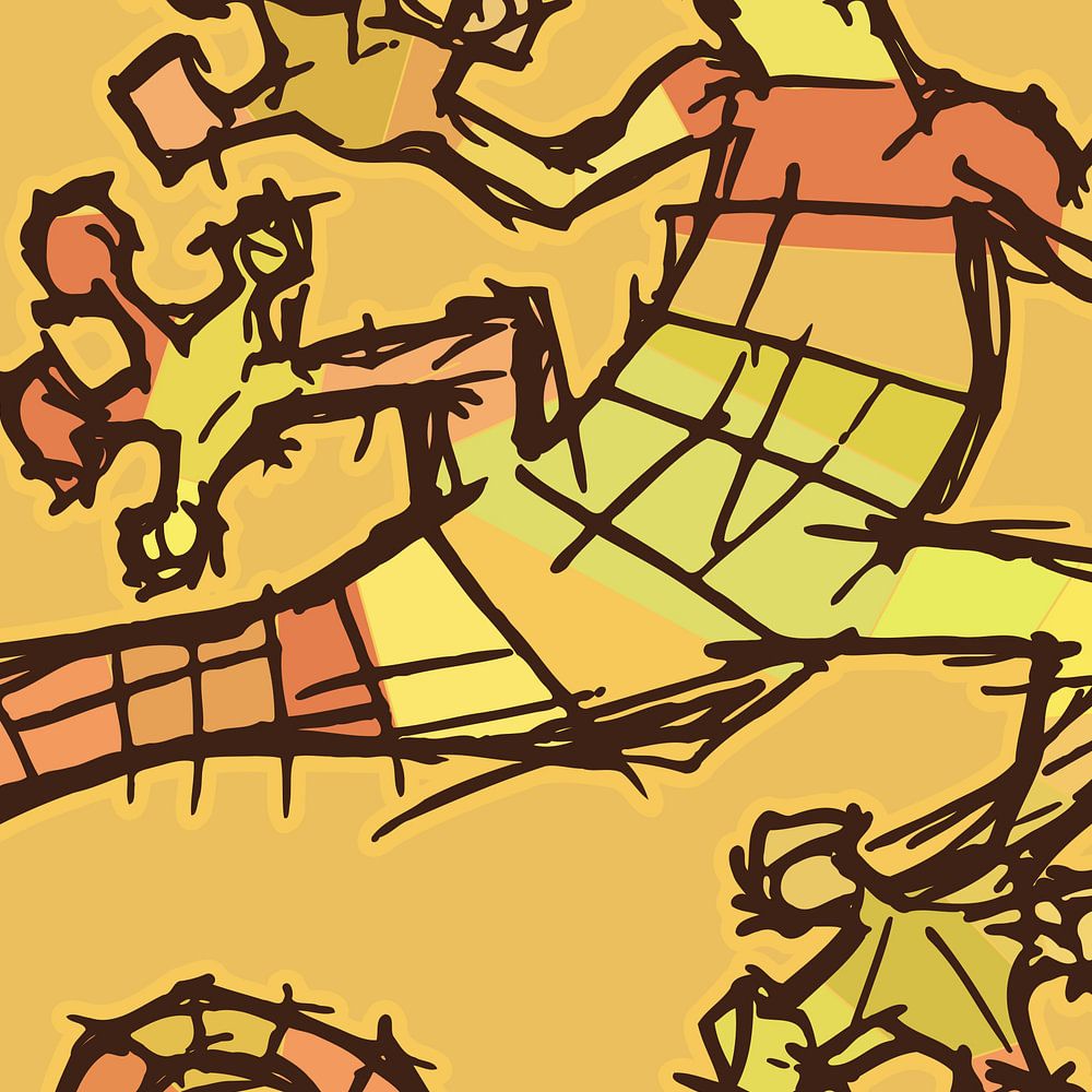 Ruwe lijnschets in gekleurd met warme roest bruine en oranje tinten afgewisseld met groen en beige.