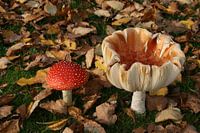 Beide paddenstoelen staan in deze kleurrijke herfstfoto gebroederlijk naast elkaar, alsof ze tonen hoe verschillende soorten het samen goed kunnen hebben.