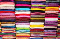 Kleurenpalet, kleurenspel. Stapels kleurrijke en glanzende zijden stoffen, textiel in bonte kleurschakeringen in een winkeltje op Dong Xuan markt, Hanoi, Vietnam. Vietnamese zijde is een populair souvenir. De stoffen met een luxe uitstraling voelen heerlijk zacht aan, met dank aan de zijderups. Een lokale kleermaker kan er in no time…