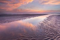 Een kleurige zonsopkomst op het strand in de zomer. De prachtige kleuren spiegelen in het laagje water