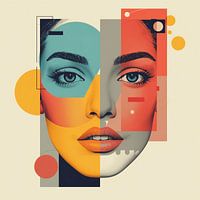 Een abstract kunstwerk dat de gelaatstrekken van een vrouw bedekt met verschillende gekleurde vormen. De compositie is fris, elegant en visueel intens.