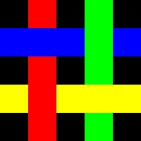 Permutatie met rood, groen, blauw en geel. Achtergrond en midden zwart.