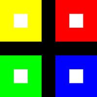 Permutatie met rood, groen, blauw en geel. Midden wit, achtergrond zwart.