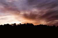 Warm getinte in een donkere vibe zonsondergang in het noorden van Spanje langs de kust. Tinten van paars, oranje en roze schijnen door de donkere wolken. Een mooie silhouette van de rij bomen boven aan de heuvel