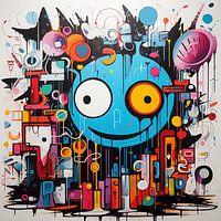 Een abstract kunstwerk met een blauw gezicht en diverse kleurrijke vormen en lijnen.