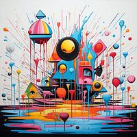 Een levendige en speelse abstracte stadsgezicht met een verscheidenheid aan kleurrijke vormen en vormen.