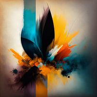 Abstract dynamisch mixed media schilderij met felle kleuren op een sepia kleurig papieren achtergrond.