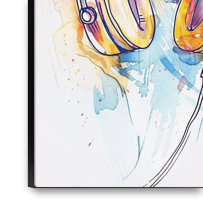Laat je meevoeren op de golven van geluid met deze levendige aquarelprint van een koptelefoon. De spattende kleuren en vloeiende lijnen creëren een gevoel van ritme en beweging, alsof de muziek zelf tot leven komt. Een perfecte aanvulling voor elke muziekliefhebber die zijn of haar passie voor muziek wil laten zien.