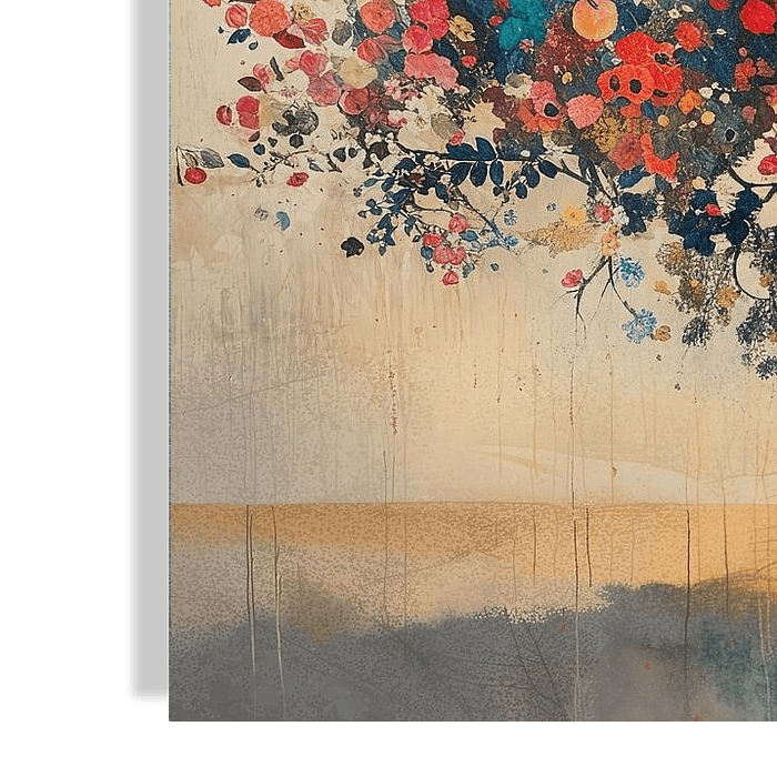 Kleurrijk Boom Schilderij | Eternal Spring Magic - Dit kleurrijke bomen schilderij vangt een prachtige uitbeelding van een robuuste, majestueuze boom wiens takken volhangen met een explosie van bloemen en vruchten. De boom staat centraal op het canvas, met een dikke, kronkelende stam die geschilderd is in diepblauwe en zwarte tinten, wat een sterk contrast vormt met de levendige kleuren van de flora. De bladeren en bloemen lijken bijna te dansen in de wind, waarbij een scala aan kleuren van zacht roze en helder rood tot diverse schakeringen van oranje, geel en violet wordt gebruikt. De takken strekken zich uit tegen een subtiel getinte achtergrond, die een zachte, bijna dromerige sfeer oproept, met hints van lichtgeel en beige die het licht van de zon suggereren. Dit schilderij zou perfect passen in een verzameling van kleurrijk, modern botanisch kunstwerk. Lente in kwadraat.