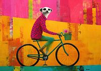 Kleurrijk Dierenkunst - Dit speelse en kleurrijke schilderij toont een meerkat in een levendige, roze bedrukte trui, nonchalant fietsend tegen een achtergrond van abstracte blokken in roze, geel en groene tinten. Het gebruik van felle kleuren en het komische onderwerp voegt een vleugje humor en levendigheid toe aan elke ruimte.