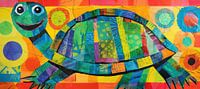 Kleurrijk Dierportret - Op dit kleurrijke doek zie je een speelse representatie van een schildpad, samengesteld uit een collage van diverse patronen en kleurrijke segmenten. De achtergrond is een fel palet van primaire en secundaire kleuren, met toegevoegde cirkelvormige elementen die een dynamisch en vrolijk geheel creëren.