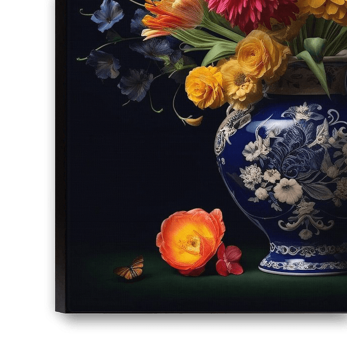 De kunstenaar heeft met meesterlijke penseelstreken de essentie van elk bloemtype gevangen, waardoor een boeket ontstaat dat bruist van vreugde en levenslust. Dit schilderij is niet alleen een visuele ervaring, maar een viering van het kleurrijke geluk dat bloemen met zich meebrengen.