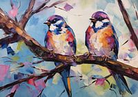 Kleurrijk Gevederte - Twee vogels, vereeuwigd in een levendige, impressionistische stijl, prijken trots op een tak. Hun verenkleed, een mozaïek van blauw, oranje en wit, brengt een speels kleurenspel in elke ruimte terwijl de achtergrond, een zachte compositie van pasteltinten, zorgt voor een frisse, luchtige sfeer.