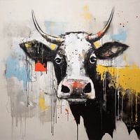 Dit levendige kunstwerk onthult een koe, niet alleen als een eenvoudig dier, maar als een wezen vol karakter en emotie. De mix van primaire kleuren, zoals het stralende geel en het heldere blauw, contrasteert prachtig met het natuurlijke zwart en wit van de koe, wat het geheel een moderne, abstracte uitstraling geeft. De druipende verfeffecten geven een gevoel van beweging en spontaniteit, terwijl de ogen van het dier een diepe, bijna menselijke expressie hebben. Dit is een koe die, in al haar kleurrijke glorie, de toeschouwer uitnodigt om verder te kijken dan het oppervlak.