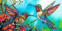 Dit prachtige schilderij, geschilderd met acryl op een canvas van 140 x 70 cm, vangt de levendigheid en gratie van twee kolibries in de lucht.