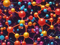 Deze afbeelding is een levendige uitbeelding van moleculaire schoonheid, een brug tussen kunst en wetenschap. De complexiteit van atomen en moleculen wordt hier gevierd met een explosie van kleur en licht, waardoor een visueel spektakel ontstaat dat zowel de geest als de verbeelding prikkelt. De diepe, rijke kleuren en de glanzende texturen suggereren een ruimte waarin het kleinste deel van onze realiteit een groots kunstwerk wordt. Het is een stuk dat de curiositeit en de verwondering voor de natuurwetenschappen kan aanwakkeren.