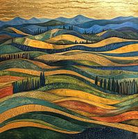 Kleurrijk Landschap - Dit abstracte landschapsschilderij toont een gelaagdheid van rollende heuvels in een rijk, kleurrijk palet, waar de natuur in zijn puurste vorm wordt gevierd.