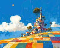 Kleurrijk Landschap - Dit kleurrijk schilderij toont een fantasierijke structuur opgebouwd uit blokken in diverse kleuren, geplaatst in een landschap met een helderblauwe hemel en gegroepeerd met bomen en lichte wolken, onder een kleine oranje zon.