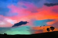 Digitaal schilderij van een minimalistische Landschap met een kleurige hemel, die bijna surrealistisch is. Het kunstwerk is geschilderd in de stijl van een pastelkrijt tekening.