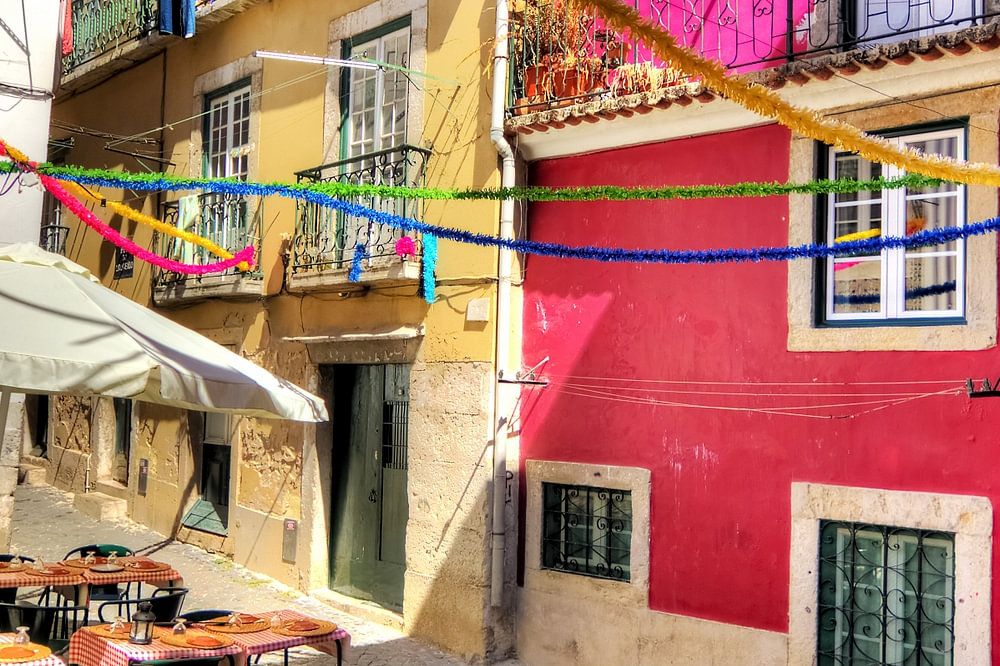 Prachtige opname van een typisch kleurrijk pleintje en smalle straatjes in Lissabon, Portugal, met slingers en een terrasje