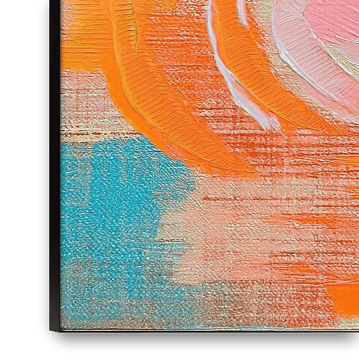 Een kleurrijk abstract schilderij met een veelkleurige linnenstructuur achtergrond die wordt gedomineerd door tinten roze, oranje, goud en aquablauw.