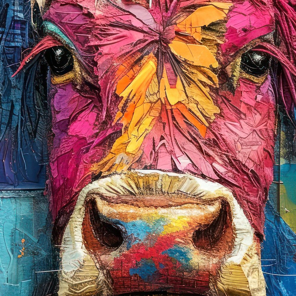 De expressie van de hooglander is een mengeling van nieuwsgierigheid en rust, met een directe blik die de kijker uitdaagt. De gebruikte kleuren en texturen zijn zowel ruw als verfijnd, wat het artwork een eclectische en moderne uitstraling geeft.