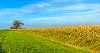 Rijpe snijmais op een akker naast het riet en het gras van de oever langs de Nederlandse rivier de Mark bij het dorp Terheijden, gemeente Drimmelen in de provincie Noord-Brabant. Door de felblauwe lucht, het frisgroene gras en de geel gekleurde mais ontstaan er kleurrijke vlakken en convergerende lijnen in deze compositie.