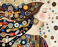 Kleurrijk Portret - Op dit moderne vrouwenportret schilderij zie je een zijprofiel van een serene vrouw met lang, donker haar verrijkt met kleurrijke, abstracte patronen en decoratieve cirkels die een dynamisch en feestelijk gevoel uitstralen.