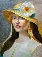 Bijzonder portret van een vrouw met grote hoed met bloem in Retro/Vintage stijl.