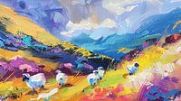 Op de voorgrond van het schilderij zien we een groep schapen, geschilderd met losse, vlotte penseelstreken die zowel hun vorm als hun beweging suggereren. Hun vachten zijn…