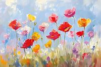 Dit prachtige kunstwerk toont een kleurrijk bloemenveld in abstracte stijl. Het ontwerp is een explosie van kleur, met levendige rode, gele en roze bloemen tegen een zachte, blauwachtige achtergrond. De penseelstreken zijn vloeiend en expressief, wat het schilderij een dynamisch en levendig gevoel geeft. Dit kunstwerk zou perfect passen…