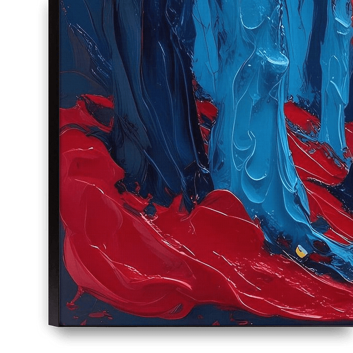 Dit opvallende kunstwerk toont een abstract boslandschap in levendige, contrasterende kleuren. Met dikke verfstreken in rood, blauw en geel wordt een unieke interpretatie van bomen en paden neergezet, wat zorgt voor een dynamisch en expressief geheel. De kleuren lijken bijna met elkaar te dansen, waardoor je ogen constant worden…